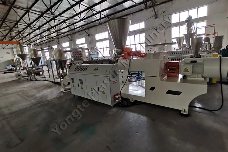 2024 ခုနှစ်တွင်၊ ကျွန်ုပ်တို့သည် ပြန်လည်အသုံးပြုထားသော PVC နှင့် CaCO₃ အဖြည့်ခံမှ PVC masterbatch granules ကိုထုတ်လုပ်ရန် အထူးဒီဇိုင်းထုတ်ထားသော ပိုလန်ဖောက်သည်အတွက် စိတ်ကြိုက် PVC ကွန်ပေါင်းအမှုန့်ကြိတ်စက်ကို တီထွင်ခဲ့ပါသည်။ CaCO₃ အဖြည့်ခံအကြောင်းအရာသည် ဖောက်သည်၏ထုတ်လုပ်မှုသတ်မှတ်ချက်များနှင့်ကိုက်ညီရန် 40% နှင့် 80% ကြား လိုက်လျောညီထွေဖြစ်အောင် ချိန်ညှိနိုင်သည်။ အဓိက အစိတ်အပိုင်းများတွင် အလိုအလျောက် feeder၊ SJSZ80/156 conical twin-screw extruder (75kW motor with ABB frequency inverter၊ တည်ငြိမ်သောလည်ပတ်မှုအတွင်း ~50KW ကိုစားသုံးသည်)၊ တူညီသော granule ဖြတ်တောက်မှုအတွက် ပူသော pelletizing die နှင့် 304 stainless steel three-stage fast air cooling and conveying system တို့ပါဝင်သည်။ စက်သည် တစ်နာရီလျှင် 300-400 ကီလိုဂရမ် ထုတ်လုပ်မှုစွမ်းရည်ကို ရရှိပြီး 24/7 စဉ်ဆက်မပြတ် လည်ပတ်မှုအား လုံးဝရပ်တန့်သွားအောင် တည်ဆောက်ထားသည်။ တပ်ဆင်ခြင်းအား အဆုံးမှအစအဆုံး အကူအညီပေးသည့် Yongte ၏ ကျွမ်းကျင်သူအဖွဲ့မှ ပံ့ပိုးကူညီမှုဖြင့် တပ်ဆင်ခြင်းမှာ ချောမွေ့သည်။ တပ်ဆင်ပြီးနောက်၊ ဆိုက်တွင်းလေ့ကျင့်ရေးသည် ဖောက်သည်၏ဝန်ထမ်းများအား စက်ကိရိယာများကို ကျွမ်းကျင်စွာလည်ပတ်စေရန် စွမ်းဆောင်နိုင်ခဲ့သော်လည်း ဗီဒီယိုလမ်းညွှန်မှုမှတစ်ဆင့် အဝေးမှနည်းပညာပံ့ပိုးမှုအကူအညီသည် ပြဿနာများကို ချက်ချင်းဖြေရှင်းနိုင်ကာ အနှောင့်အယှက်မရှိဘဲ ထုတ်လုပ်မှုနှင့် အမြင့်ဆုံးစွမ်းဆောင်ရည်ကို ထိန်းသိမ်းထားသည်။